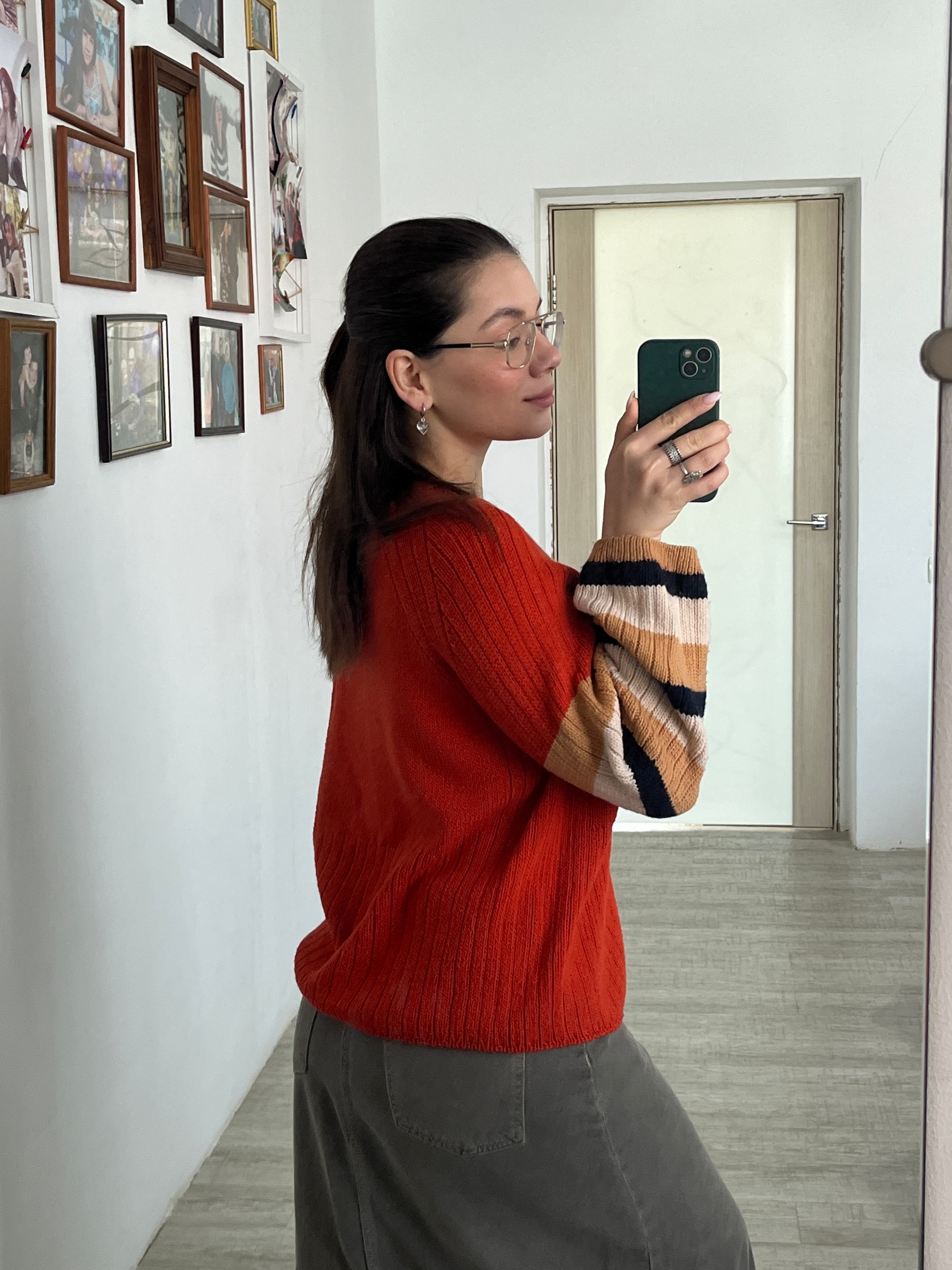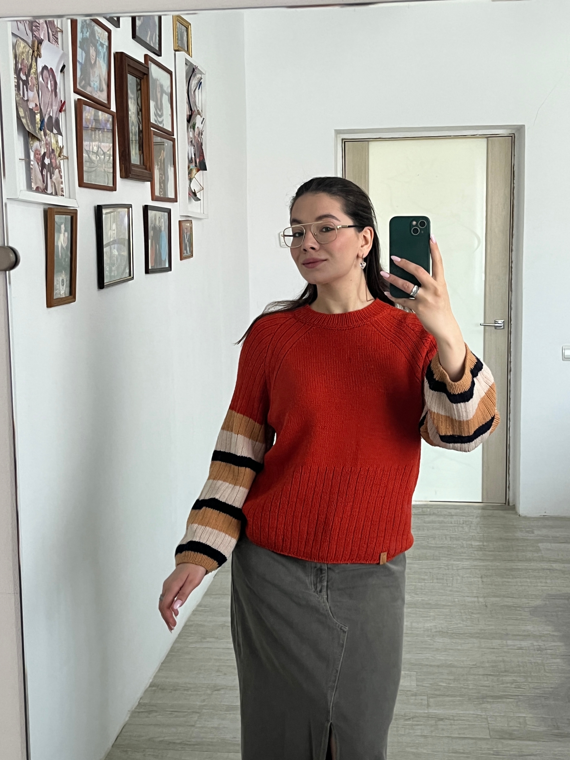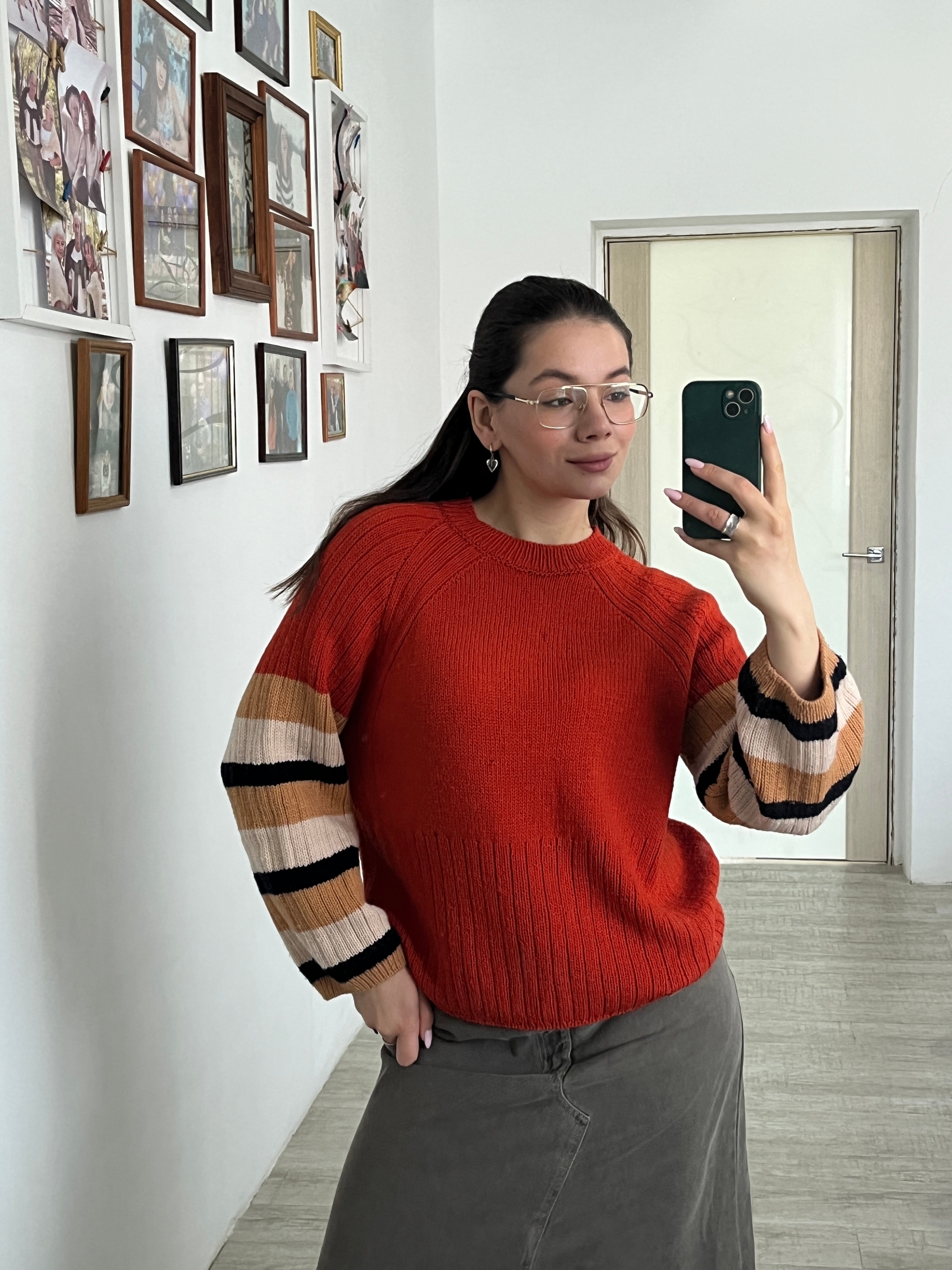 Основной кирпично-яркий цвет делает образ выразительным, а полосатые рукава в оттенках молочного, карамельного и тёмно-синего добавляют дерзкого оригинального шарма.