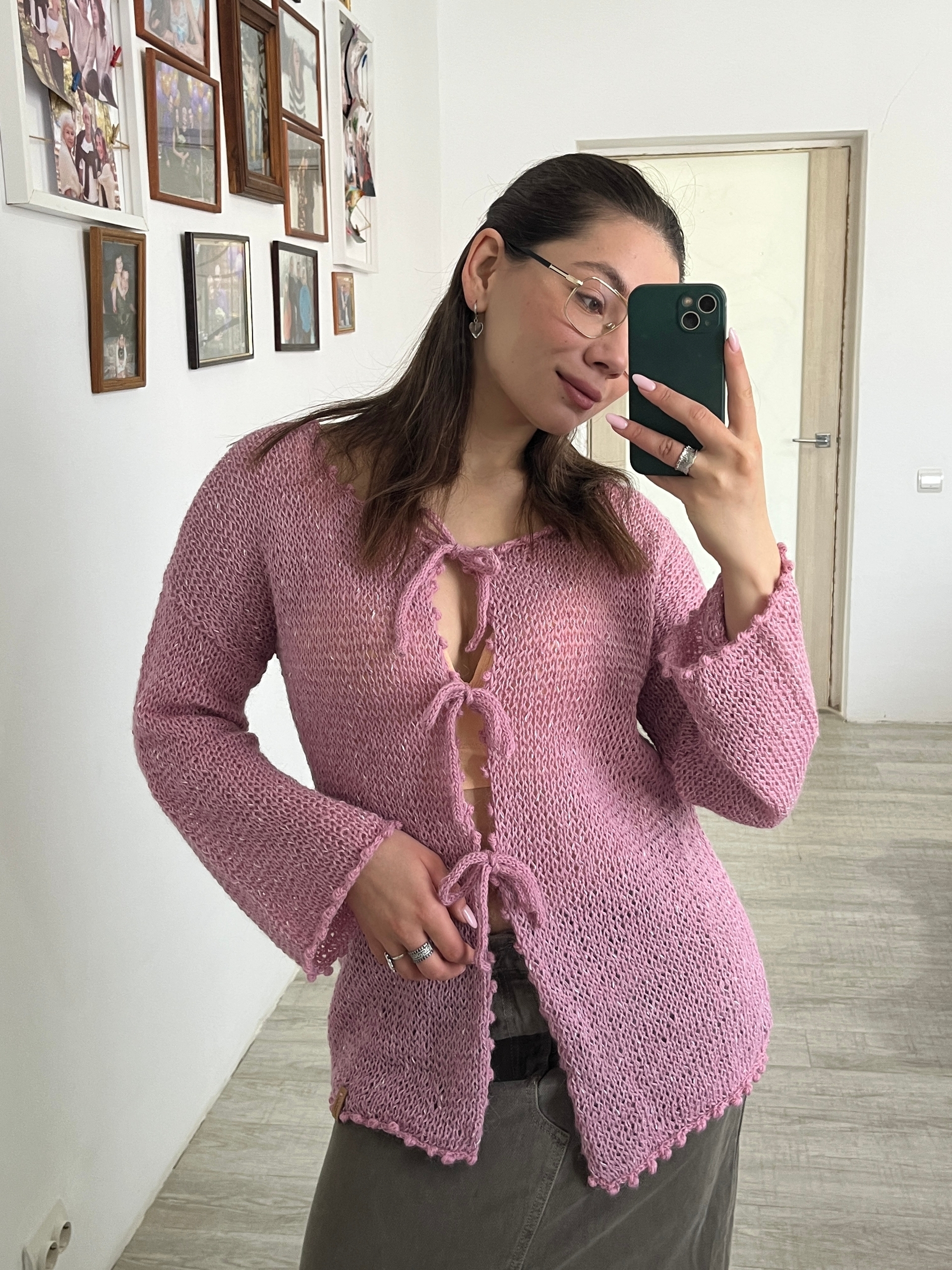 Двухсторонний кардиган на завязочках в нежном оттенке пыльной розы - это идеальное сочетание стиля и комфорта. Связан вручную из премиальной 100% перуанской альпаки итальянского производства и люрексовой нити. Размер 48-52. Почувствуйте тепло и мягкость натуральной шерсти высшего качества. Цена: 8 000 рублей.