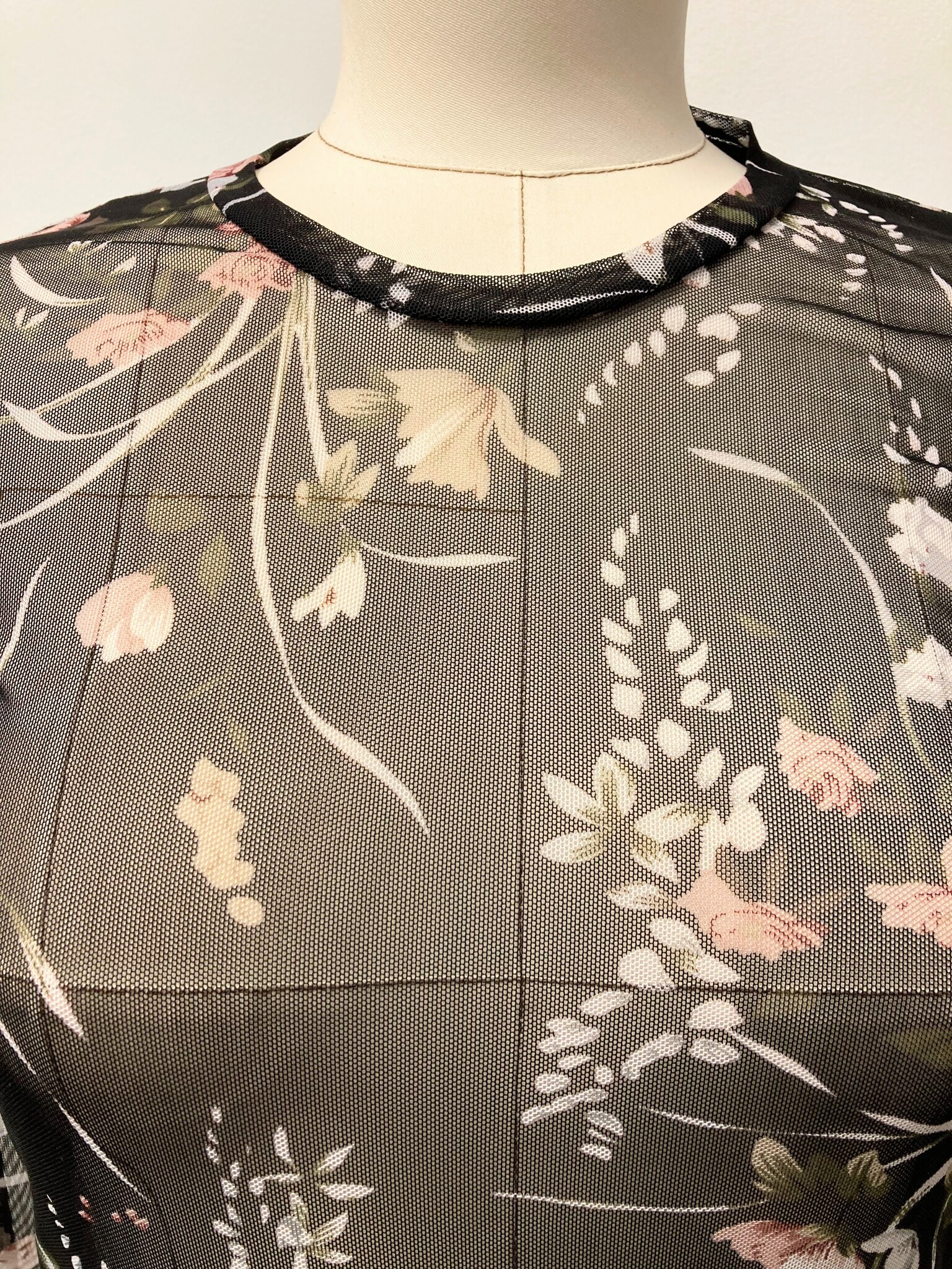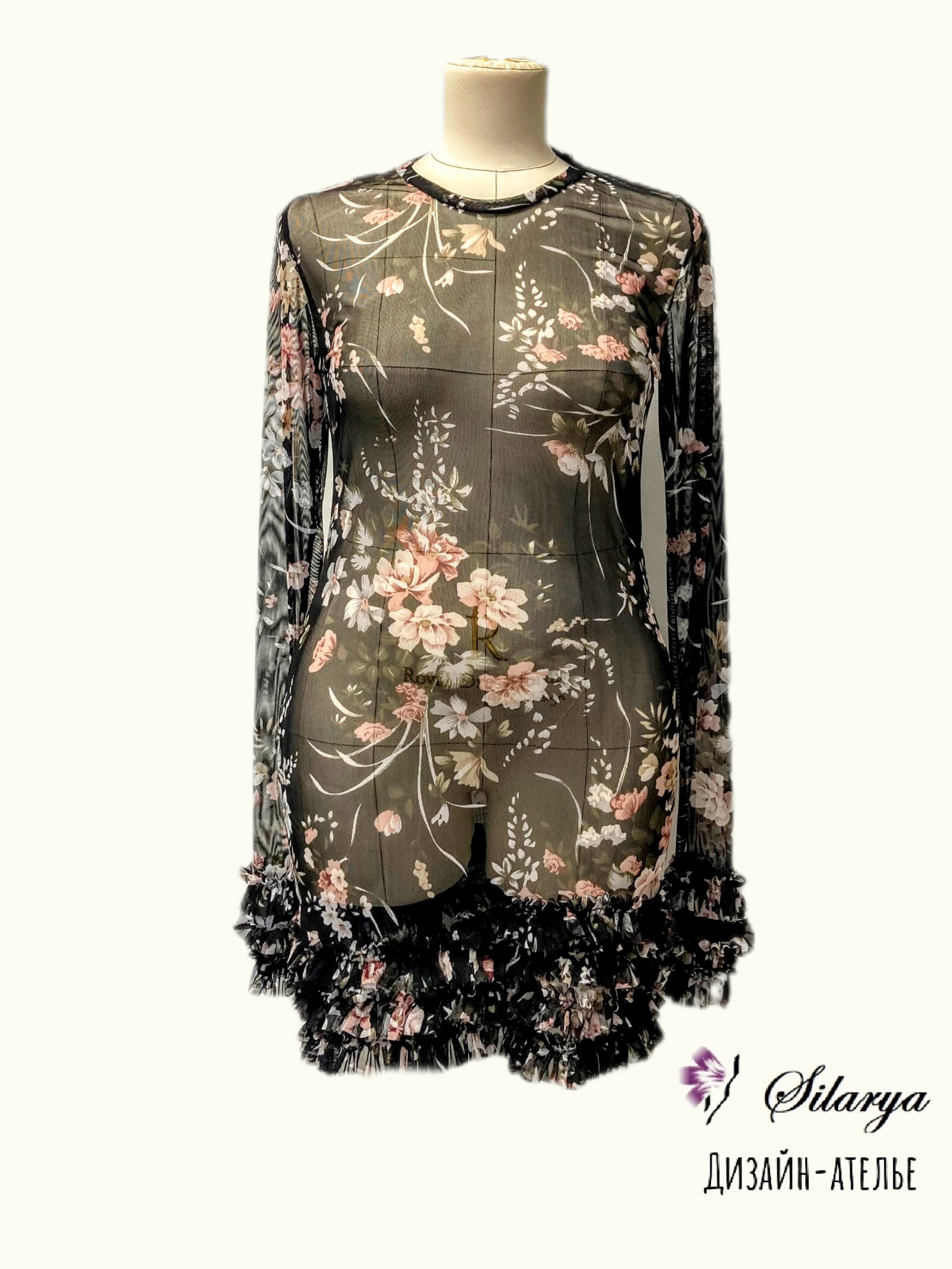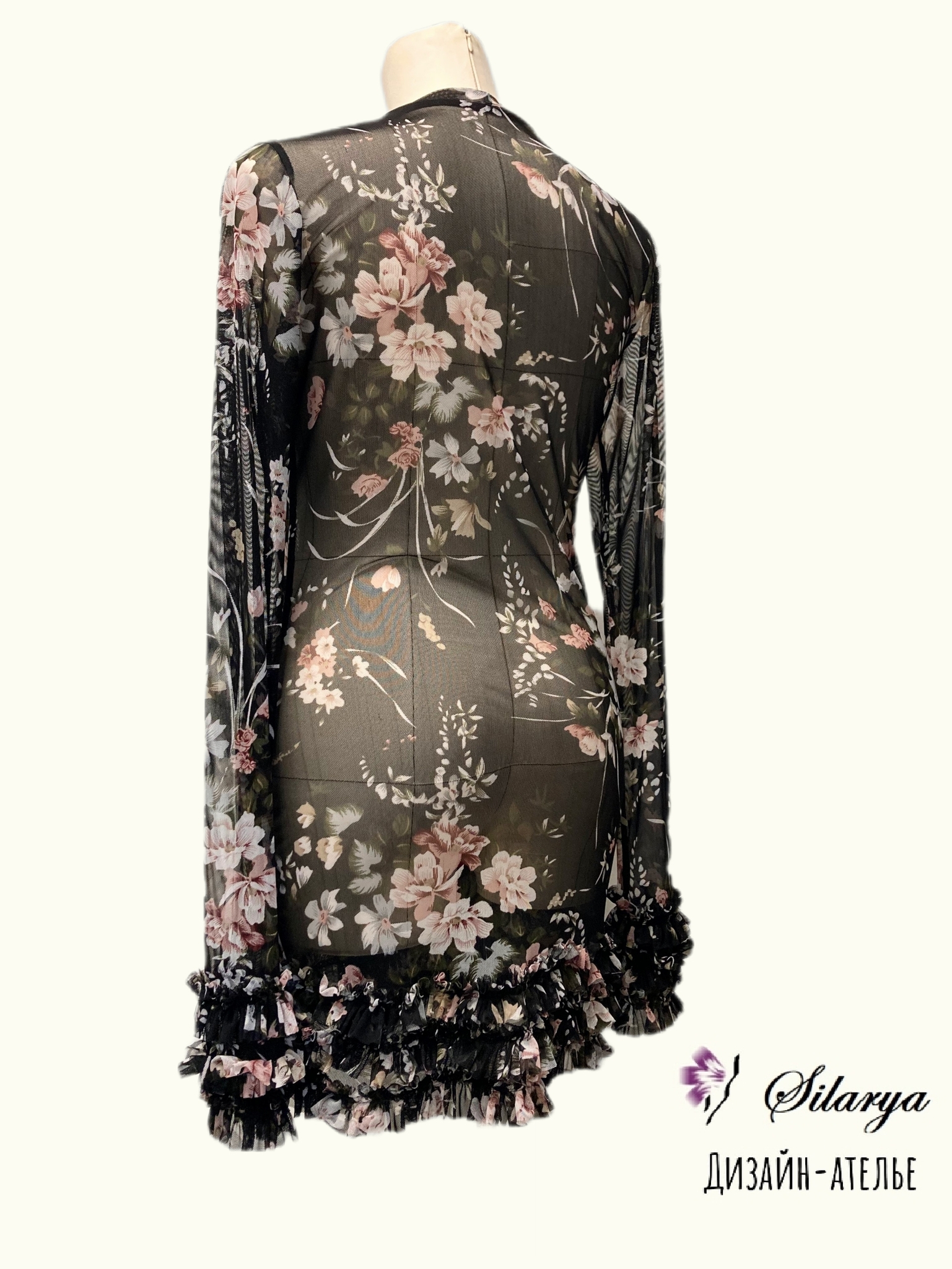 Платье-сеточка "Тайна" выполнено из эластичной сетки с цветочным принтом на черном фоне, маленький воротничок-стойка мягко облегает зону декольте, по низу платья и рукавам дополнено пышными оборками из сеточки. Очень нежно смотрится в сочетании с пиджаками, сарафанами, кардиганами. Может использоваться самостоятельно для романтических встреч.
